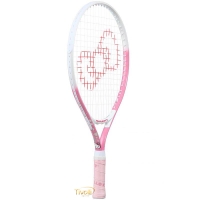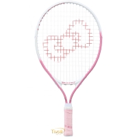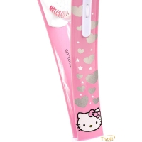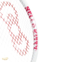 Essa raquete tem um acabamento rosa em pintura com a identidade da Hello Kitty, detalhes completos com um logotipo de laço nas cordas.