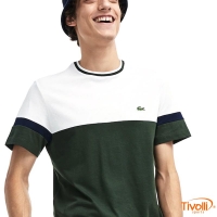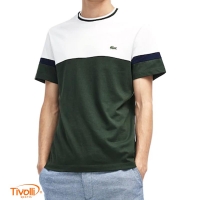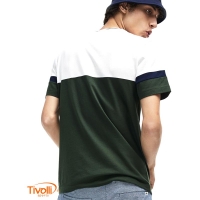 Possui gola careca bicolor canelada e o tradicional crocodilo verde bordado no peito.