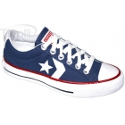 De lona na cor Azul marinho, com detalhes em vermelho escuro e aplicação de estrela branca em couro.