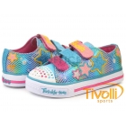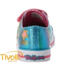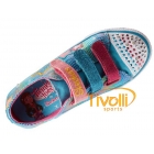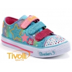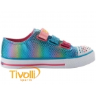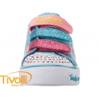 O Tênis Skechers Kids Twinkle Toes Light Up multicolor, possui uma textura de tecido estampado metálico com paetês para um olhar brilhante e divertido. Luzes divertindo na biqueira e lateral projeta piscar a cada passo! As três tiras frontais são ajustáveis com um gancho e fechamento com velcro para o ajuste perfeito.